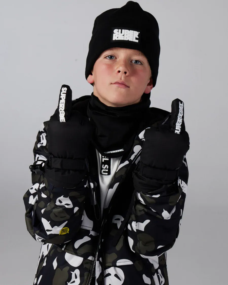 BE BRAVE și pregătește-te pentru aventuri de iarnă în stil SuperRebel! #SuperRebel #BoysSkiJacket #KidsWinterGear #BlackAlloverPrint #10kWaterproof #SustainableKidsWear #WinterOutfit #BeBrave